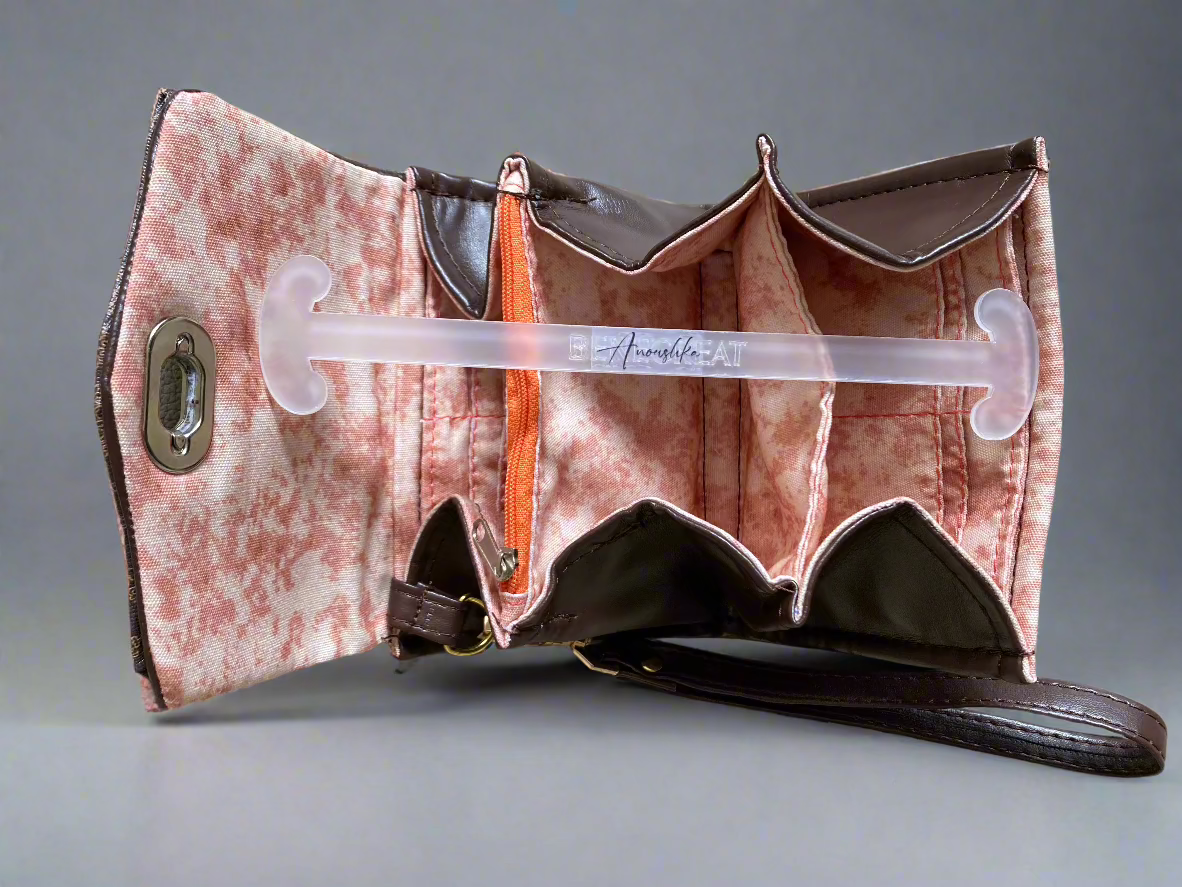 The Mini Necessary Clutch Wallet delivers the comprehensive functionality of the original design in a more convenient format. This streamlined accessory offers eight dedicated credit card compartments, dual slip pockets for receipts or notes, a secure zippered section for coins, and two spacious central compartments for organizing larger essentials. The wallet's efficient design maximizes storage capacity while maintaining a sleek, portable profile.