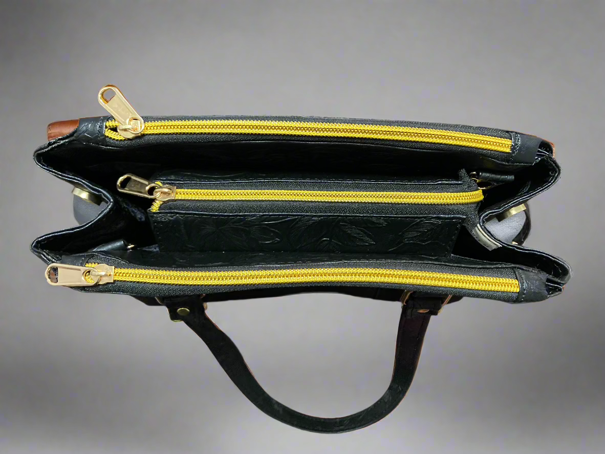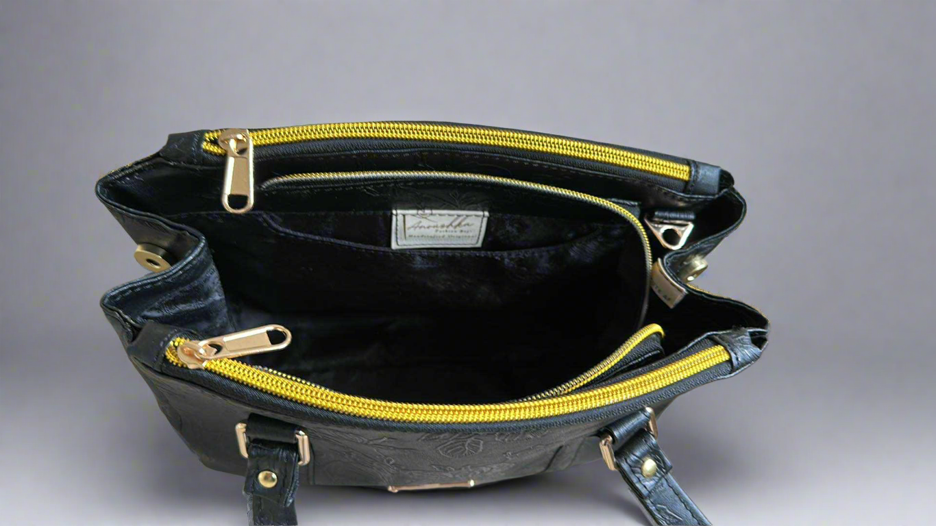 Introducing the Rowena floral black handbag, a perfect blend of luxury and functionality. With dual zipper pockets and an expandable enclosed interior with a slip pocket, this modern take on a timeless design is both elegant and practical. Upgrade your wardrobe with this versatile and stylish accessory.
